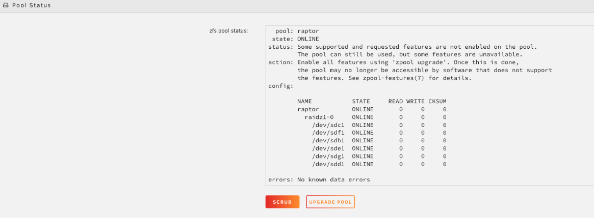 • En Estado del Pool, verifica el estado y haz clic en Scrub.